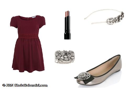 Aksesuarlarınızda altın tonları yerine gümüş tonları da tercih edebilirsiniz. Bordo elbisenizle ten rengi rujunuzu uydurabilirsiniz. Yüksek giymekten rahatsız olan ve uzun boylu bayanlar içinse, gümüş şık babetler, bu elbise için kombinlenmiş.